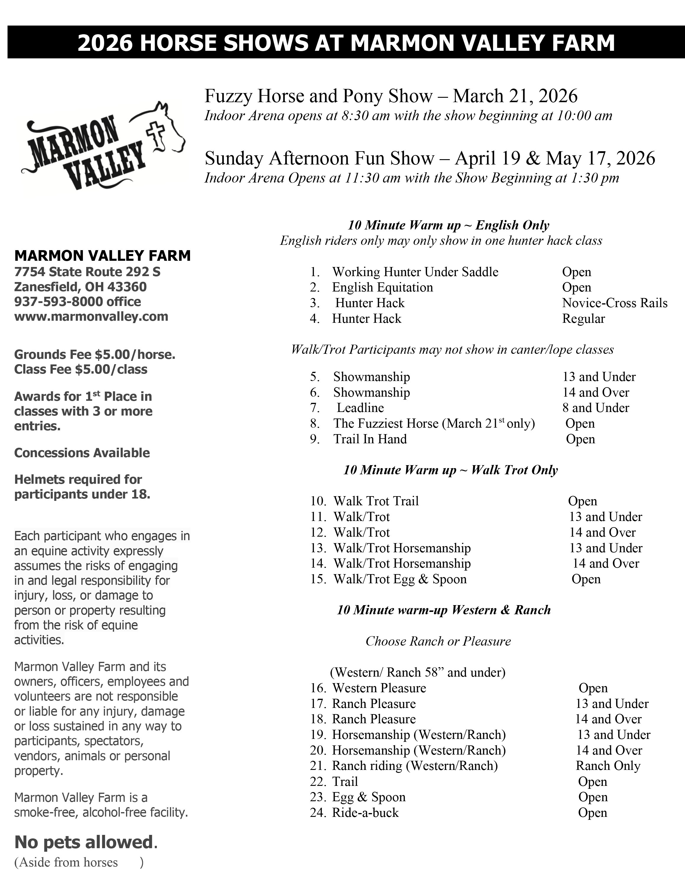 Fuzzy Horse and Pony Show – March 21, 2026: Indoor Arena opens at 8:30 am with the show beginning at 10:00 am